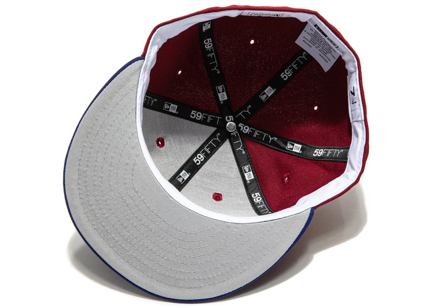 The New Era Toronto Blue Jays Sangria 20th Anniversary Patch Hat Club Exclusive 59Fifty Fitted Hat Cardinal/Royal is now available at Side Kicks!